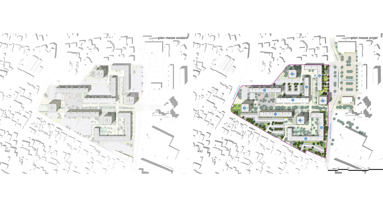 C’est à partir de ces composantes urbaines fortes et existantes du site que nous avons imaginé la création d’une place Centrale qui permettrait à terme d’être un élément de « cohésion sociale » fort du Quartier. Véritable « Agora », lieu de croisements et d’échanges elle permettra l’articulation entre la Cité Maurice Thorez et son quartier.