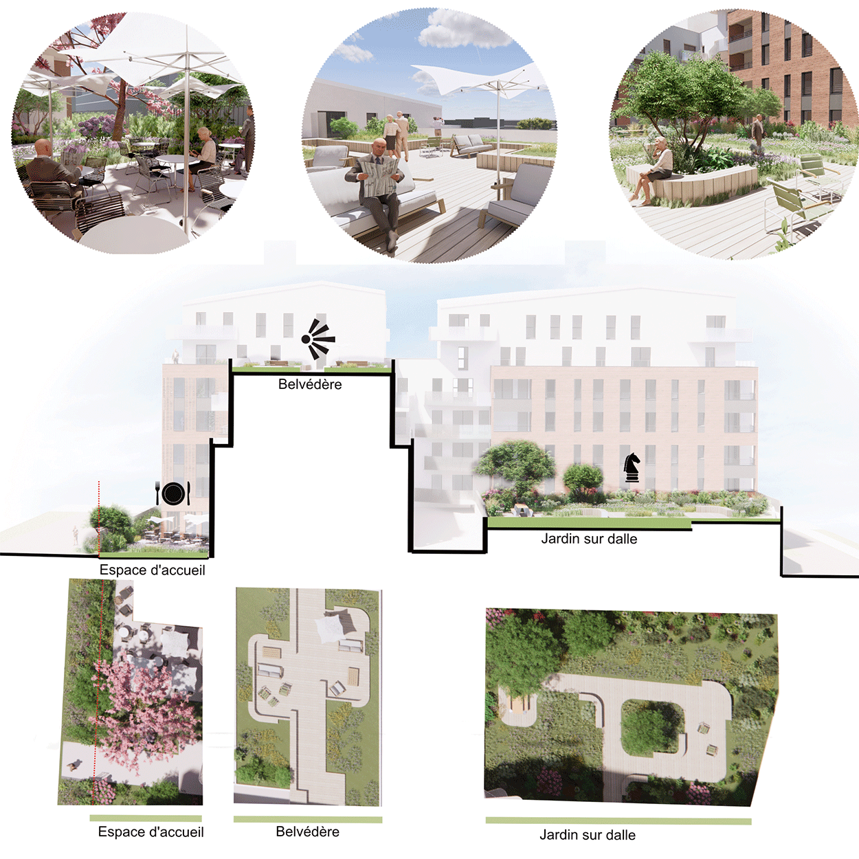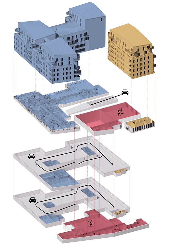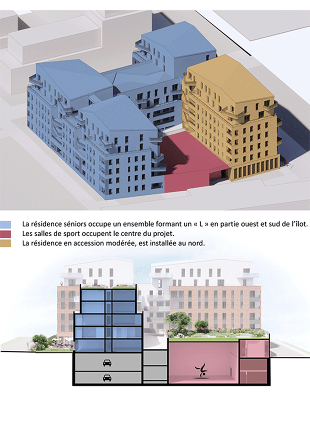 Programme Création d’un ensemble d’habitations dont une résidence séniors de 100 unités, 28 logements en accession, un équipement sportif accueillant un dojo et une salle de gym.