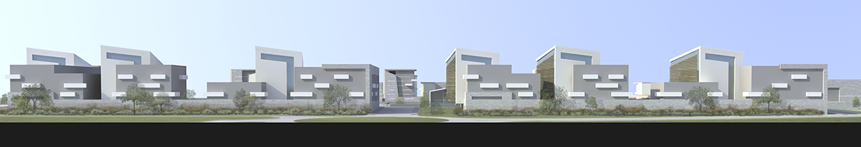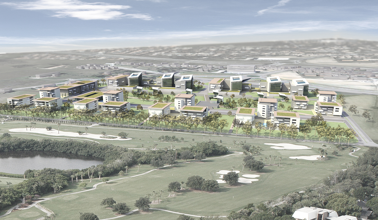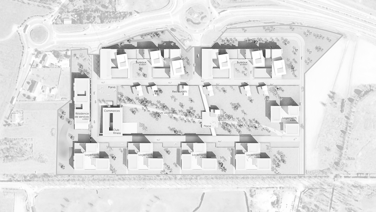 Entre rocade et golf, se développe un terrain au grand potentiel. Des îlots de logements largement espacés s’installent naturellement au sud vers le paysage et le calme du golf. Alors que les bureaux profitent de l’accroche visuelle depuis la rocade et forment ainsi écran naturel pour l’ensemble du site.