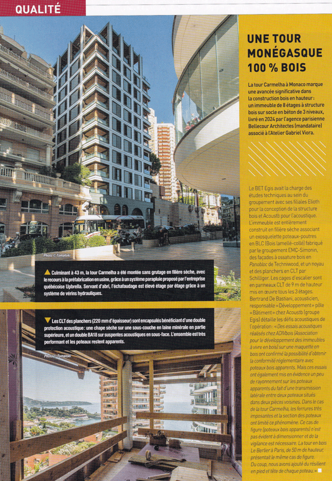 « La tour Carmelha à Monaco marque une avancée significative dans la construction en bois en hauteur : un immeuble de 8 étages à structure bois sur une socle en béton de 3 niveaux, livré en 2024 par l’agence parisienne Bellecour Architectes (mandataire) associé à l’Atelier Gabriel Viora […] »